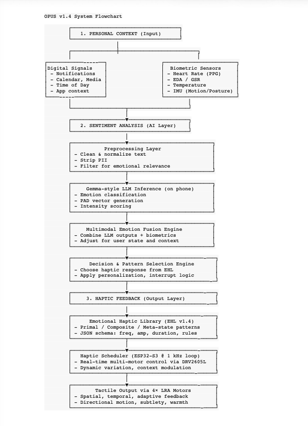 The v1.4 revision builds on this vision with an expanded Emotional Haptic Library, new emotion classes, composite blends, and ambient meta-states. It introduces personalization through a companion app and adaptive AI that learns from user feedback and physiological signals. Hardware improvements add biometric sensors for context awareness while refining comfort, materials, and battery life. The AI pipeline has been upgraded with a lightweight 4B-parameter model for faster, more accurate sentiment analysis. Current work is focused on validating the haptic language, fine-tuning adaptive learning, and integrating the new sensing features to move Opus closer to a production-ready device.